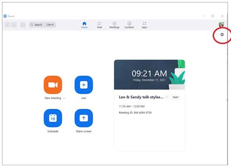 Select the “Settings” wheel in the upper right corner of your Zoom Home screen.