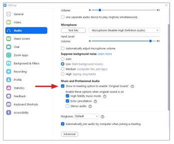 Make sure that “Show in-meeting options to enable ‘Original Sound'” is CHECKED!
